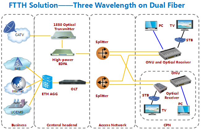 Symmetrical transmission rate of 1Gbps for downlink and uplink Network coverage radius: 20KM Optical connector: SC/PC High sensitivity optical receiver ≥-26dBm Transmitting power:0~4dBm Security: ONU identification mechanism |